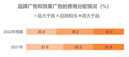 ● 报告显示,2021年广告主将52.5%预算用于品牌广告、47.5%用于效果广告。而在2022年,广告主品效预算占比的差额进一步收窄,分配预期更加均衡。