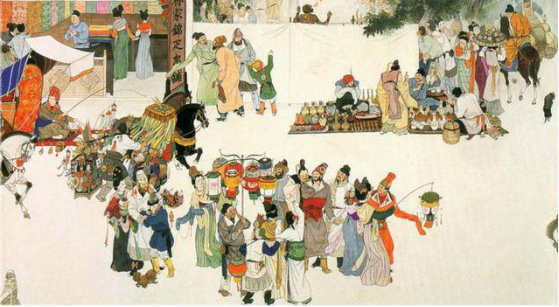 隋唐时期,除了传统的户外广告,还出现了较为特色的商品展销会。为了展示都城的繁华富裕,隋炀帝时期曾多次在丰都市专门进行商品陈列和展示,上面有各种各样丰富多彩的户外广告形式,如旗帜、招牌等等。