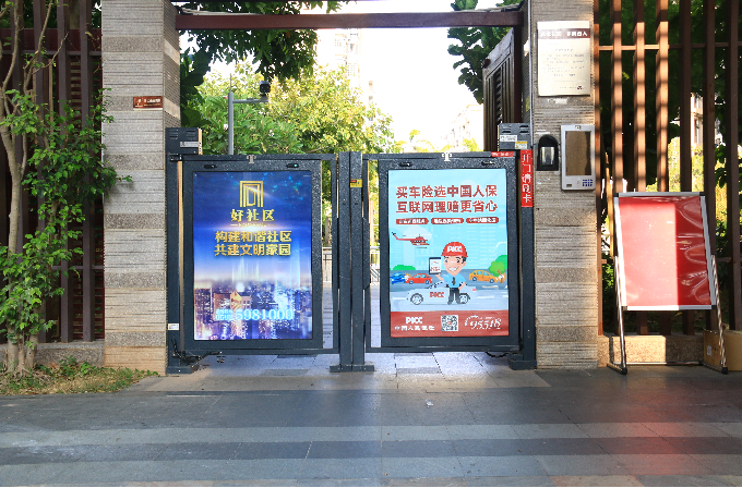 好社区广告门设置在住宅社区人行出入口位 置。在该广告画面的可视范围内,仅有1个画 面出现在受众眼前。该广告客户可以独占这一受众的100%注意力。